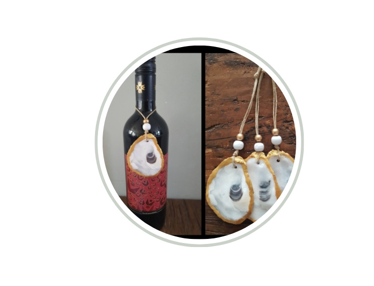 Deze hangers zijn gemaakt van de oesterdeksels en zijn 7 cm lang.