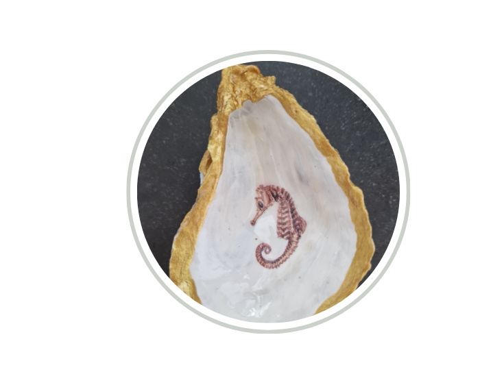 OverzichtLosse oester met afbeelding bruin zeepaardje. Deze oester is 8,5 cm lang en 5,5 cm breed