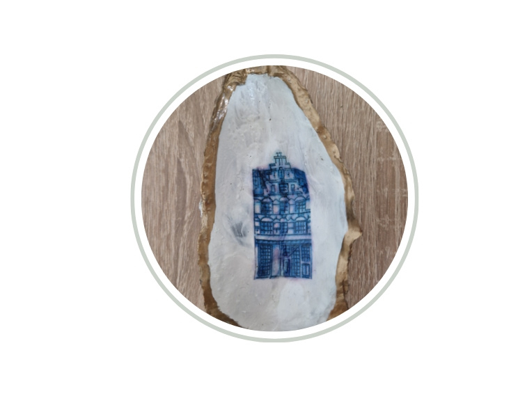 Losse metallic gouden oester met 1 grachtenpandje in Delftsblauw