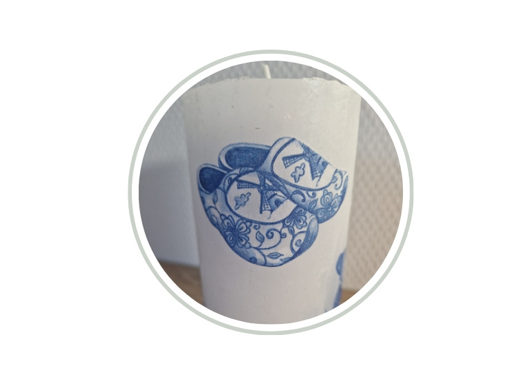 Gedecoreerde kaars Holland thema NIEUW!!!Deze gedecoreerde kaars met Holland thema is leuk om cadeau te geven als Holland souvenir door de Delfts blauwe afbeeldingen van een kussend paartje, klompen, tulpen en een molen.