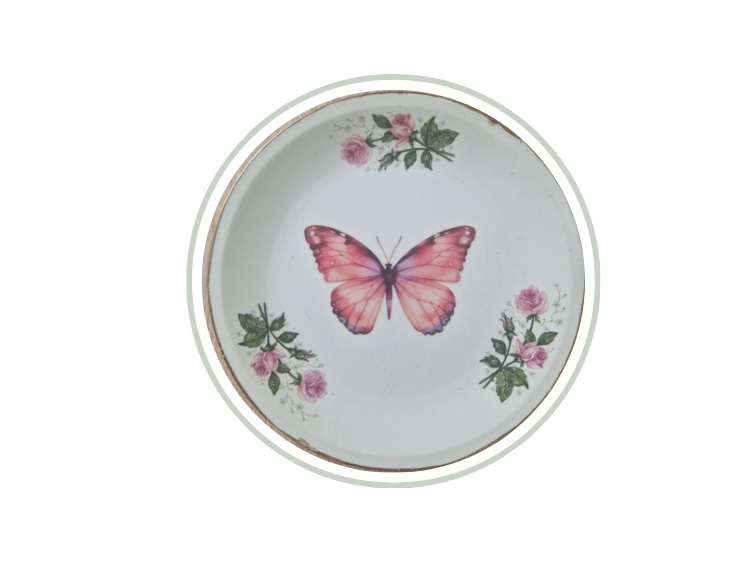 Gedecoreerd vintage bordje roze vlinder NIEUW!!Leuk bordje, diameter ca. 15 cm. Uitsluitend geschikt als decoratie!!