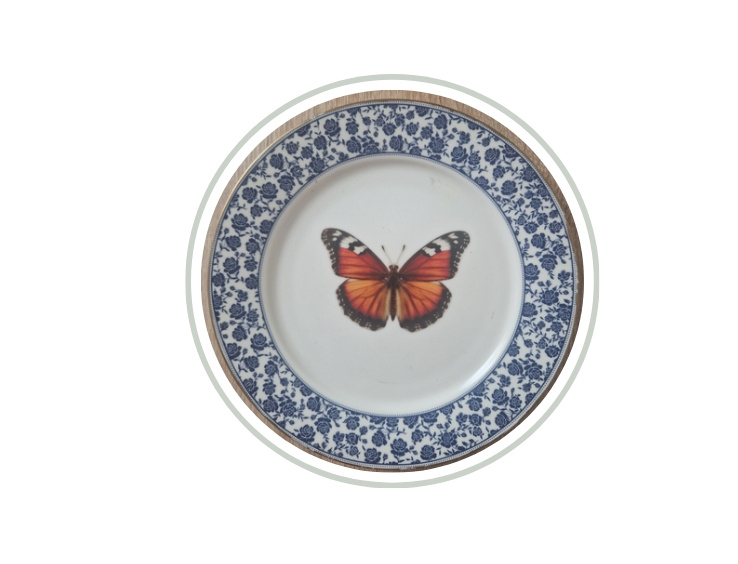 Gedecoreerd vintage bordje blauwe rand vlinder NIEUW!!!Leuk bordje, diameter ca. 20,5 cm. Uitsluitend geschikt als decoratie!!