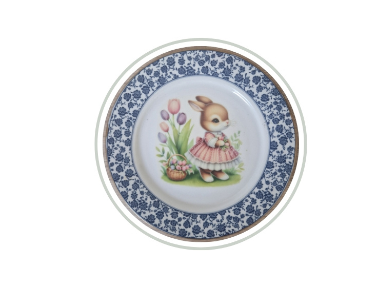 Gedecoreerd vintage bordje blauw konijn met mand NIEUW!!!Leuk bordje, diameter ca. 15 cm. Uitsluitend geschikt als decoratie!!